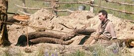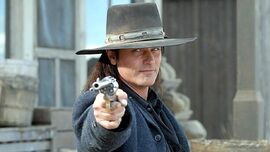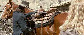 在与小村居民的相处过程中,一颗坚硬的、逃亡的浪子之心开始慢慢被软化,为了很好的刻画这种变化,导演给我们留下了几个特写镜头——当蒙大拿小子要离开时,在远处看到珍因处理不好自己的牲口而尊下伤心落泪时,他选择了为她找回跑掉的牲口并衣着光鲜、穿着得体的像个绅士的陪珍参加了舞会,而且在他们参加舞会坐车离去的时候,导演用了大约不少于5秒钟的特写镜头给我们展示留在屋子里桌子上和枪套中的枪。