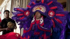 二为印第安chief坚持要在嘉年华前夜遵照民族习俗巡游,chief以他的智慧和对本族传统的执着,终于把浩劫后分散的人心渐渐修补汇聚,找到人手与他一起筹备游行。在每年必备的新仪式服装全部毁于洪水之后,他们想赶嘉年华前再做出整套全新的仪式服饰。可以理解为这是族群的领袖希望通过恢复传统仪式,在灾后的社区恢复族群的信心与凝聚力。他为了争取政府批准族人搬回未在灾害中破坏、却被封闭的住宅楼,冲撞警察、违犯法令,被监禁而错过了第一次嘉年华的游行,获释后终于穿着节日盛装参加了第二次游行。但他与警察已经结下了仇,加之官方对印第安族裔大半夜里咋咋呼呼、走街串巷的“邪门活动”显然相当警惕甚至带有敌意,因此他与族人要面对的不仅是灾后重建的困顿,还有社会对印第安族裔的不理解、忽视甚至排斥。但chief以自己的坚毅与耐心,赢得了后辈的认同与尊崇。印第安人的吟唱与舞动充满了神圣感和韵律感,他们反复唱着祖辈传下的咒语,孓孓行走在现代城市暝寂的夜色里,那鲜艳的羽毛与闪亮的饰物尽管都是工业产品,连唱词也是半英文的,但坚守祖辈精神和本族群传统的决心却显出不容玷辱的威严。