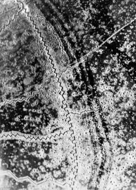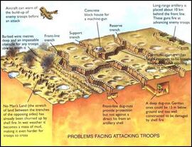 在这样的大环境下,堑壕战孕育而生,先介绍一下战壕的基本组成:一战的战壕通常由一系列的两条,三条,四条或更多条相互平行延伸且至少长1.6公里的战壕线组成。前线战壕通常只有少量守卫部队,只在清晨和傍晚进入战壕进行防守任务。第二条是支援战壕,当前方战壕遭受炮击,部队会撤回到这里。第三条是预备战壕,里面有另一支部队,如果前线战壕被攻下后这只部队可以尝试反击。