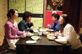 唔,所以要提防某一刻你可能会发现你上当了。家人般的四人围在桌边,小田切吃进蛋黄酱后故作难吃要去喝水,结果他望着满脸笑意的暖灯下的三人,把玻璃杯中的水径自倒去了。1小时40分钟的电影离结束一点一点临近的时候,好像一集时效快要播完的舍不得。尤其是那个开场塞袜子的大叔和某极衰大学生一同坐上云霄飞车的时候。两个无亲无故的大男人怎么看起来同游乐场那么相配?嘻嘻哈哈返老还童。大脑随着风驰电掣哗啦啦地重返过去,昏黄的记忆回路貌似出了差儿,多麽美好而温柔的气息,那是否是真的?咖喱很好吃,人生的幸福时光如同吃一盘咖喱那样短暂,呼啸而过。闷头一点一点吞咖喱的小田切的眼泪,我和他一起流。