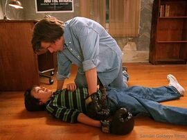 其次是小儿子弗兰克和父亲更加恶劣的关系。如果说琼对大儿子沃尔特还在母亲传统的生活细节上照顾得很周全,伯纳德则是在两方面都很糟糕,他的智慧讲坛在小儿子眼中是难以接近的严厉和说教;他的关心更是霸道而毫无尊重可严的。影片一开始就非常高明地指出“因材施教”是多么重要的事情,伯纳德在绕圈子找位置停车时,第一次和小儿子一起,后者表示想先下车被他制止,而第二次和大儿子在一起后者则主动表示要陪他一起绕上几圈,这两个迥然不同的细节指代的父子问题从头贯穿到影片结束的。子不类父是最根本的原因,对9岁左右男孩来说,崇拜哥哥和父亲是最常见的行为,然而他显然是被权利中心驱除在外的落雁,于是在温柔的母爱中继续他的淘气生涯和偶尔的男子汉行为构成了他颇为古怪的少年时代。