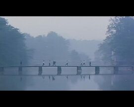 小勇一次又一次的跑过青葱流水中的坝,翻上石台,钻进木头栏,回家。他不从门回家,他跳,他翻,他钻,他这样回家。