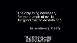 但面对在正义面前蛰伏着的邪恶,柏克警示道:“只要善良的人们袖手旁观,邪恶就会高奏凯歌。”这便是描述希特勒崛起的影片《Hitler: The Rise of Evil 》片首出现的“恶人得胜的唯一条件,就是好人袖手旁观”的由来。