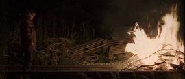 影片中的时间进程一直处在看似凝固,实则缓缓延续的状态中.没有任何代表新生希望的火车到来的消息,也没有任何关于对杀夫仇人惩罚的暗示,沧凉的背景下,悲观无力的人们只是黯淡地生存下去,仅此而已.本以为故事会以这样一种无望的姿态走向完结,临近片尾处火与孩子那充满隐喻的一幕又让人心念大转:赤裸的孩子试图燃烧自己寻求涅槃,被陌生男人阻止,男人抱着孩子,独自叨念着那些关于明天美好生活的景象,不停地说着.黑暗中摇曳的火的意象让人看到了重生和救赎的希望,可又仿佛是对人类无休止地的自我毁灭和自我救赎的隐喻.