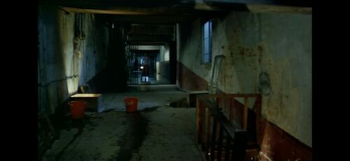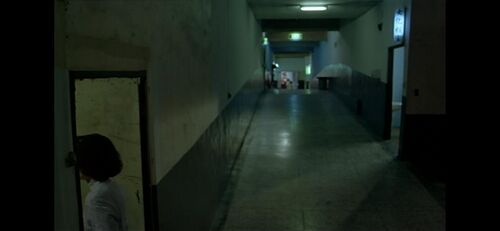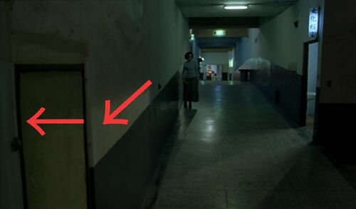 在这个画面中,我们首先看到的是一个拱形的走廊(通过地面、横梁与墙壁在远处的交错构成拱形)——这是纵深线条与横向线条共同确立的;接着我们会留意到一左一右的两扇门,右边那扇门很显然嵌在走廊的墙壁上,门框顶部与底部的横线条与走廊的纵深方向是平行的,并且我们能看到它左边的门框而看不到右边的门框——对“嵌入”状态的描述。