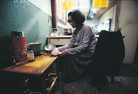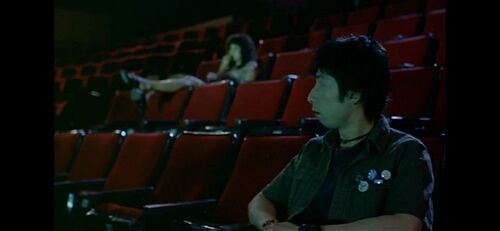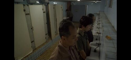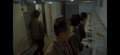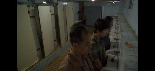 而被安排为空间解释者的角色也是表意的工具。最明晰的表意来源是:日本人为点烟借火的历程也是他作为一个同性恋者寻找同类的过程,但当他最终借到了火,却只等来一句礼貌性的“撒有那啦”。他在影院里靠着同性坐,在厕所挨着同性尿尿,在储物间的狭小过道里与同性相向而行、挤压、摩擦、离开——一种身体性的“亲历”,作为他诠释空间的方式,也是他找寻同类的方式。