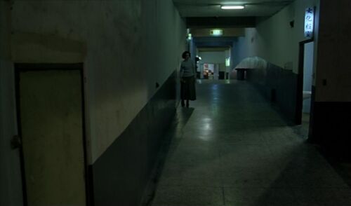 若单看画面右边,银幕的透视暗示着它是被一个侧仰的角度所目击的。但将目光置于画面的左下角时,光所勾勒出的规整矩形又提醒着观众这扇门所在的平面与镜头所在的平面是近乎平行的,只是角度略有倾斜。空间被拆散,组接,并在观众脑内产生想象性的重构——这一场景的成立,是否意味着门框所在的平面与银幕平面之间的黑暗处存在着一个折角?还是银幕平面本身是具有一定弧形的曲面?对“平面”的确信产生了动摇。但是在门还未打开时,阴影模糊了门框的线条,右边的银幕主导了整个画面的透视角度,在镜头前呈现出一个绝对角度的平面,而打开这扇门的角色,则为观众从二维的平面中撕扯出一隅纵深的可能。光与影与镜头角度使空间发生某种视觉上的语意不明,模糊了空间中透视线的指向性,而其中的人物则被安排为解释空间构成的叙述者。它强调角色的“亲历”而非镜头的直击。全片的声音设计也是如此。纪录片领域的“静观电影”一说大抵可以套用在此处。“静观电影”之静观,指的是一个摄影机对现实进行选材的过程,这个过程里作者以不介入的方式拍摄。当然这里说的不介入不一定是完全纪实性的,不介入的拍摄同样也会去调度、去引导,但作者会尽可能地抹除介入的痕迹。比如香特尔·阿克曼的静观是对“表演”的不介入。而《不散》中的蔡明亮则是对空间的不介入,他让演员去介入、去亲历空间,用声音暗示画面之外的空间,摄影机虽然并非停滞不动,且在大部分时候空间形态都简单得一目了然,但即便在产生视觉歧义时,它也不会去主动地去游历,主动地目击空间的各个角落,它将空间形态的最终解释权交给角色,交给声音。