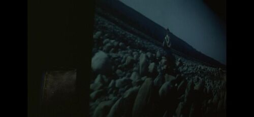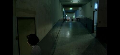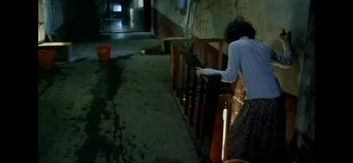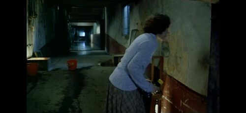 日本人“遇鬼”这段,镜头先以正反打交代了两人的位置关系。女人磕着瓜子,发出清脆的声响,这时候,一个硬物扣地的声音提醒了观众她左脚的鞋掉在了地上。随后,她做出了摄影机理应做出的动作——寻找声源,而声源处于画外。于是她也进入了某种程度上的“画外”。而摄影机仍然是固定的,没有被角色的运动带动,也没有被声源牵引。
