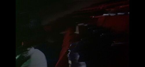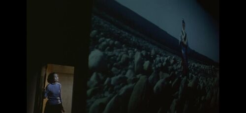 随后,嗑瓜子的声音再度出现,紧接着的一个横摇似乎是全片唯一一次镜头被声音牵引的运动,它达成了一种灵异的效果:磕瓜子的声音仿佛成为了女人在场的前提。如角色所说“这个戏院里有鬼”,日本人所感受到的诡谲来自声源的漂移,而镜头所“感受”到的诡谲则是空间对画外声源探寻者的彻底的消形,以至于需要一次罕见的运动才能重新确立她在空间中的位置。