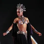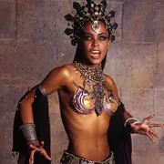 黑女王版阿卡莎亦是一番别样的魅惑撩人。她走进那个隐秘的吸血鬼酒吧,伴着水蛇腰的扭动,每一个步调都似乎踏着韵律,仿佛懵懂少女初次踏入令人目眩的花花世界,一派天真无知而又野心勃勃。她走着,吸引一众目光却只是顾自好奇而感兴趣地东张西望,继而被吧台后荧幕上莱斯特的身影吸引。看着他,她知道她爱他。当她听到一个吸血鬼对她说出他们打算毁了莱斯特,她的身躯是最妖娆魅惑的舞动,脸上依然带着小女孩般的甜蜜笑容。她剜出了他的心。