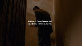 从第5分钟起,每一个镜头的画框都包含了一个画框(a frame within a frame)。由于花样年华故事发生的地理空间有限,许多场景会重复;而以这个楼梯为代表的镜头更是会反复出现,从而产生一种循环的感觉(出现在这个楼梯镜头的,前几分钟是梁朝伟,后几分钟就是张曼玉)。这种“画框中的画框”理论同样可以套用在Punch-Drunk Love里面。比如,Barry见到姐姐和Lena来了,十分紧张,慌忙走出办公室。办公室门口的门框自然而然地就构成了分割线