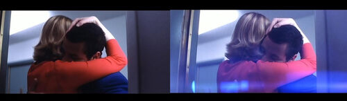 Barry还准备握手呢,怎料Lena走上前,直接一把搂住Barry,送了他一记十多秒的热吻。这三个镜头构成了一个正反合命题,最后以这样一个三等分画面结束。