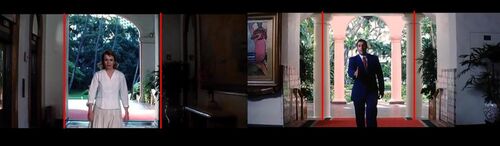 Barry与Lena相约在夏威夷一个公园相见。Lena欢快地从远方走来,等候已久的Barry慌张地伸出右手准备握手。两人在各自的镜头中都处于两条分割线中间(同时也是画框的中间)——我已用红色线标出了分割线,形成了一个三等分(thirds)。PTA“迫使”我们注意Barry和Lena各自的神态表情。