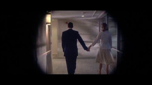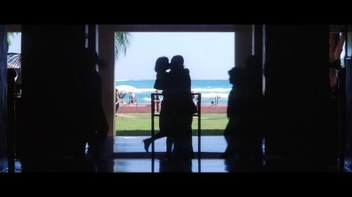 左图是Barry正准备去验票,此时他正处于灭点,沿着纵深线索线一步步向航空公司的验票处走来(航空公司验票员穿的是红色衣服——不妨看做是“Lena正在远方的夏威夷等待着我”的象征)右图则是Barry验票后走沿着通道走向飞机,此时又形成了一个纵深平面,Barry又一次处在灭点上;在远处,一道白光仿佛在“召唤”着Barry值得注意的是,在左图,Barry是朝向摄影机运动,靠近镜头;在右图,则是背向摄影机运动,远离镜头。而摄影机仅仅是处在登机走道90°拐角处而已,就像站在路中间看着Barry的走近与远去。3.Barry和Lena在夏威夷相遇后,来到了Lena所住的酒店。两人一言不发地沿着酒店走道行走着。走廊的天花板、墙壁以及壁灯都形成了纵深线索,灭点则处在Barry和Lena两人之间。这个纵深线索,可以看做是对两人漫长情感历程的写照——“走了这么久,终于到这一步了”