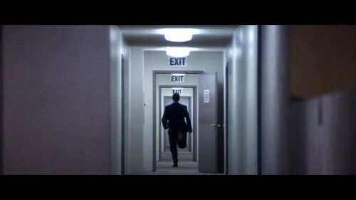 那一扇扇门以及门上面的“出口”标志牌,同样是延伸至灭点;而且“门口”和“EXIT”本身就极富象征意味(联系上文提到的Lena引导Barry走向幸福):找到Lena=找到“出路”2.Barry为了见Lena,买了机票去夏威夷,他急匆匆地走进候机室,准备登机