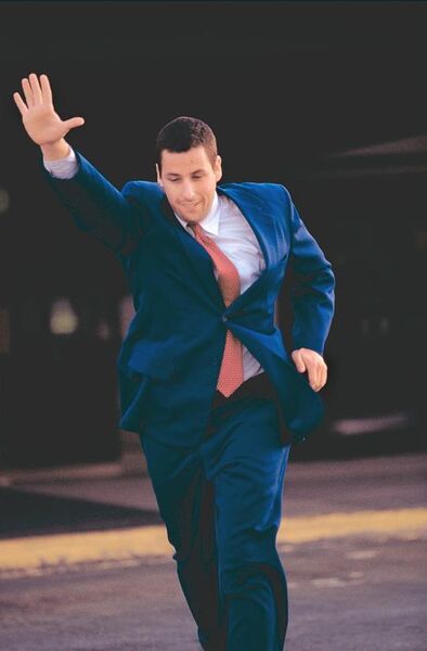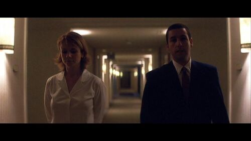 这些看起来颇为迷幻的图案,伴随着同样迷幻的背景音乐(Jon Brion创作),营造出了一种氛围,一种……老实说,我不知道到底营造出了什么(用职业影评人给我们提供的标准答案:营造出了电影主要角色情绪的表征——不过,到底是什么情绪?);可以确定的是,这些色彩代表着本片两个主要角色:亚当桑德勒扮演的小商人Barry ,以及Emily Watson扮演的“姐姐的同事”Lena。这些彩色图看似迷幻,但其实基础色就是两种:蓝色和红色。而PTA在本片里贯穿始终地“告诉”观众,Barry=蓝色,Lena=红色。从他们在影片中大部分时间所穿的衣服颜色就可以看出来(特别是亚当桑德勒,整部影片他几乎没有换过衣服)