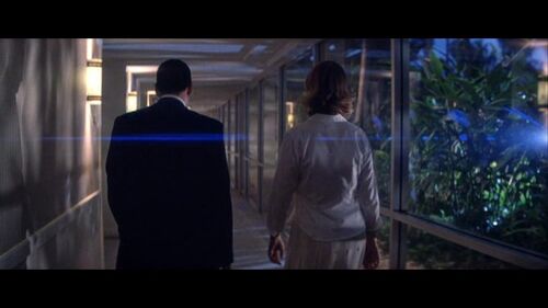 同时,按照上文提及的平面分割的方法,这酒店走廊也可以看做是一个分割线,将画面分二等分(halves)镜头隐喻1.前面我说Barry和Lena在酒店走道里漫步是象征着两人情感历程,因为“认知-了解”就要结束,进入下一个阶段。摄像机又一次在走道90°拐角处待位,当两人从走向镜头变为背向镜头运动时,一道蓝光扫过。