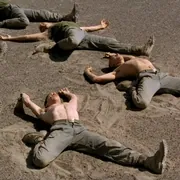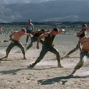 在不断变换中景与特写镜头中,我们看到摄影机始终于面孔与身体只写摆动,这些镜头与取景方式是德勒兹笔下的感知——影像与情动——影像的交互:由身体这一不确定中心生成的情绪渐渐收拢并释放于面孔——这一始终遮蔽着秘密与谵妄之处的运动器官中去。士兵们用扭曲的肢体与脸庞上的沟壑与伤痕在呐喊。那些互相之间胶着的肉体,被疲惫与饥饿折磨的脸庞,无一不在诉说着一种沉默的言语:不止于情欲,不止于军旅,不止于殖民地…而是关于内心那无法被象征秩序化的创伤与渴望,那是无关于男性的阳刚之气的,无关于体格的强健等级之分的,没有任何一个军官或者司令可以理解这一道道的伤疤。只有沉默可以理解,只有那些皮肤黑亮的农妇可以理解,只有风,沙,尘土,那些属于前生命的生成之源,能容纳下一个成年人赤裸如婴儿一般的叫喊。