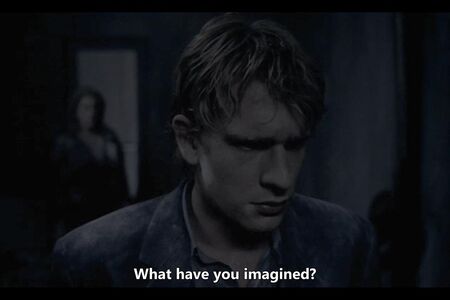 伊莎贝尔在与皮埃尔相认伊始便说:” 我告诉了你真相。我什么都不求,只求你相信我。”皮埃尔不假思索道:“我相信你。” ——充满渴望和保护欲的力量时,“相信”无需任何理由;相应的,怀疑也发生在皮埃尔精疲力竭的低谷。因为伊莎贝尔没有认出封面上的父亲,皮埃尔开始怀疑她和自己深信不疑的宿命,所以紧接着下一幕她马上就寻死了,而且皮埃尔没有看见她跳海的过程,正如看不见自己的信仰如何滑走。而故事的最后,当伊莎贝尔尖叫道“我跟你说的一直是实话’”,皮埃尔却仍然失魂落魄无动于衷时,她便真的被车撞倒了。囚车上的他仍在黑暗森林中,只是,伊莎贝尔的声音消失了。