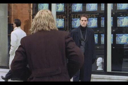 但他的权威无法帮助皮埃尔从自身的漩涡解脱。在陷入绝境的皮埃尔决意杀死蒂伯时,企图阻止他的指挥身上带着伤和血,显得有些脆弱,在问过一句“What are you doing here(你在这里做什么)”后便被皮埃尔一下子打倒。最隐晦却关键的特征是,在这部法语片中,指挥仅有的两句台词说的是英文:如果工厂仓库是二战后残破世界的缩影,或许这名指挥就是某些英语国家的化身。而蒂伯临死前,他的身后有无数电视正显示着欧洲地图:它们随着射出的子弹一并破碎,剩下一地的残片。