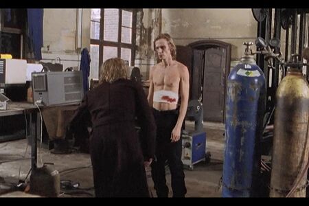 这次,回到工厂仓库,一直穿白衣服的露西也换上了黑衣服;报纸的嘲讽、信徒的离开、对观众的失望使得皮埃尔当街暴怒砸车,并给自己原本完整的身心落下残疾,悲伤地呼应了片头他在母亲眼前扮演残疾的玩笑。