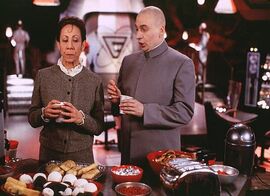 除了音乐之外,电影恶搞了很多俗套的电影桥段,比如邪恶博士与她的女助手那段激情床戏,我差点乐晕过去,恶搞无极限。片中每个角色处处都有笑点,比如迷你博士、Number Two、Scott Evil,还有那个巨恶心的肥霸,每个角色都笑点十足,想一想他们就想笑。当然,本片也没有忘记“贱”谍的本质,有些笑点还是很低俗的,比如片头全裸的大贱谍,以及那段帐篷里拉东西的场景,即恶心又好笑,重回大“贱”谍的本质。