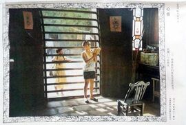京京视域中的、这一舞台上的人生的第一幕,是在楼上、天窗中京京的视点镜头和楼下乐队指挥机位中交替呈现的场景。低角度的、正面机位和高悬的、暖调的灯光的光区和背景中巨大的瓖嵌玻璃窗,划定了这一银幕上的舞台。人物﹕外公和莲姑以类水平调度的方式进出这片光区,直到他们在这一舞台上“到位”并直面(不是直视)摄影机进入“表演”。在一个正面的全景镜头中,莲姑端坐在桌旁,缓缓地、艰难地开口了﹕“他来信了。”外公﹕“谁?”莲姑﹕“……他。还活着。”外公﹕“从台湾?”此后,正面近景镜头中外公的评语﹕“四十年不忘,祖上有德呵!”“别哭了。说句笑话﹕这要在过去,还不得给你立节烈牌。”固然是外公矛盾心态的流露,仍不失为一种真诚的感叹和道德评判。影片正是以这样的方式在京京的视点中引入了这段不了情的、而不是“礼”与“名份”的故事。