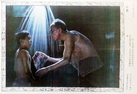 这之后,将是与莲姑的诀别。又是在京京的目击下,外公和台湾老人——莲姑的小叔、两个古稀之人,为已死者和将死者彼此相托。此时,低角度正面机位呈现出背景中景片般的门楼飞檐,上方一抹幽兰的夜空,中景里一圈暖黄的光区中心,成为剪影的一对老人搀扶、拜别。继而莲姑辞世。这似乎是“一个完整世界的陨落”。“一个世纪的终结。”外公骤然衰老了。这特定的情势、这似以注定的流逝使得京京不能再作为一个无为观者;他不能以珠珠的话﹕“大人的事,我们小孩子是没有什么办法的”来解脱自己。他不能、也不愿再作一个孩子。于是,他登台了,他行动了。当外公在将卖掉的胡琴上拉响过门之后,听到了京京气贯天地的唱腔。一个平移过黄昏时分小城上空的镜头切为外公匆匆寻声而去步履。当他到达河边时,看到决心为莲姑的超度而“募捐”的京京正娴熟、英武地将手中一柄竹杆舞得呼呼风生。这是一个意义反转、价值移置的关键场景。当外公成为“台下”的一名观者的时候,京京成了这一传统舞台上一名心甘情愿、胜任称职的演员﹕不再是一类程序或一种滥套,他用心体悟到其背后博大精深的灵魂。当京京成为舞台上的行动主体时,也是影片潜在的主题﹕其成人式的完成之时。他不再是一个朦胧的骚动、价值、秩序的混乱中受创、遭挫的孩子。这也是一个视点反转的时刻。如同对其同代人的发韧之作《一个和八个》的意义倒置的再反转,一个中景过肩镜头切为外公的正面近景,反打为外公的视点镜头﹕正面低角度的中景里,映衬着晖光遴遴的河水,升格拍摄的镜头将身着短裤、背心,手执一支竹杆的京京呈现为银盔亮甲、手舞一柄银枪、护背旗翻飞的经典少年营雄。这是一个由孩子/孙儿到老人/祖父视点的反转。正是在祖父的视点镜头中,京京的形象得到修正与重写。这是被再造与重塑的形象。于是,京京/发轻一代的成人式同时也成为一经典的臣服式。京京正是在“成人”——作为一个自觉的行为主体的同时,被祖父的视点还原为一个孩子,一个在传统、秩序、血缘、亲情中得到庇护、教诲,获得位置与确认的孩子。伴着一声汽车驶过的噪音,外公的心象消失了,满头汗水的京京面对着老人稚气地,几乎羞涩地微笑。渐次升起深情的音乐。如果说,《一个和八个》的结尾处,视点由王金到粗眉毛的反转,意味着视点权/话语权的索取;那么,《心香》此处的再度反转,则是一派臣服之中,对视点权的再度归还。