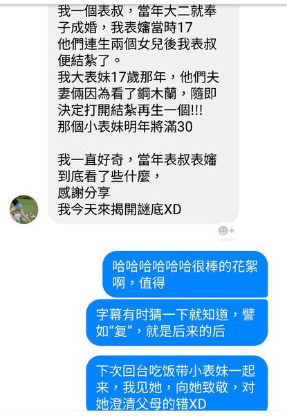 2016年我在脸书谈到奥运的中国女排:「在此插播一部美国电影《钢木兰》(Steel Magnolias),它是讲六个女人的友谊故事。十分好看!是喜剧。也是悲喜剧。~或说喜剧本身就是悲喜剧。这片1989年出品,起初是剧场的剧本。台湾有剧团演过这个剧本。~硬要套的话,这部片与女排精神可作呼应。」