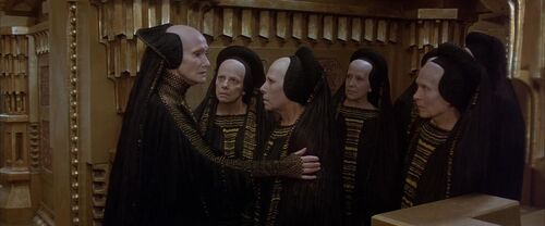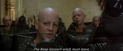 在电影里,被束缚的杰西卡和假装昏迷的保罗被同时带到了弗拉基米尔·哈科南男爵(Baron Vladimir Harkonnen)及其门塔特皮特·德夫里(Piter de Vries)面前。在小说里,只有杰西卡被带到了这两人面前。杰西卡是在被抬出去的路上看到假装昏迷的保罗的。