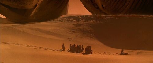 在电影里,帝国行星生态学家列特·凯恩斯(Liet Kynes)为了表达向阿特雷迪斯家族的尊敬,按照弗雷曼人的风俗向地上吐了一口唾沫。就在众人想起身反对时,莱托公爵指出了这是弗雷曼人表达尊敬的方式。随后,凯恩斯代表弗雷曼人与莱托公爵结盟。而在小说里,吐唾沫的是塔布尔穴地(Sietch Tabr)的领导人斯蒂尔加(Stilgar),做出解释的是邓肯·艾达霍(Duncan Idaho)。斯蒂尔加之所以向莱托表达尊敬,是因为阿特雷迪斯家族试图救一位被哈科南家族重伤的弗雷曼人信使。但斯蒂尔加并没有因此就与莱托结盟,毕竟他无法代表全体弗雷曼人。