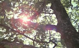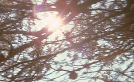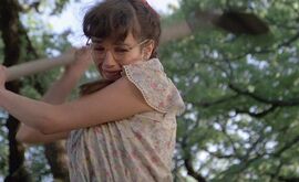 艾莲娜烦躁不安地跑到小树林中,用树枝抽打周围的树干发泄怒气。回忆再次袭来,艾莲娜望向天空,影片切换至快速移动的仰拍镜头(视线匹配剪辑)——耀眼的阳光透过疏条交映的枝叶,随后叠化入另一幅艳阳高照的枝叶图景,镜头顺势缓缓下摇,正在锯木头的九岁的艾莲娜入画。这一延长时间的匹配叠化转场不仅使过渡平缓自然,还颇具视觉美感。