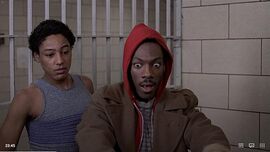 黑人盲丐还得意地在吹嘘,两个警察冷不防地一齐夹起盲丐,将盲丐悬在空中。他还缩着自己的双腿。一会儿后,才无可奈何地伸直双腿,踩在地上,他尴尬地微笑。