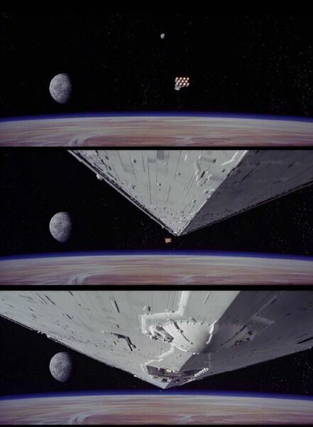 反叛军的飞船先从上方进入镜头,体积小,快速驶离镜头。帝国Star Destroyer紧随其后,同样从上方进入镜头后,迅速压倒性地占据了大部分画面,观众感受到体积的大而长,造成一种压迫感。双方力量的悬殊在一个镜头里就体现了出来。