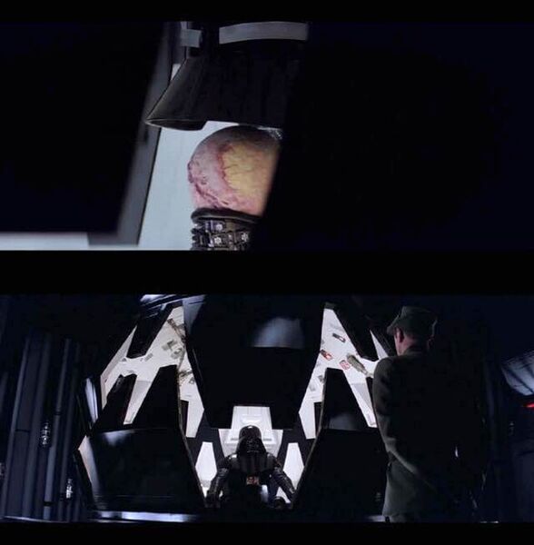 这是观众第一次看到Vader脱下盔甲后脆弱的状态,而这个状态,由这个装置表明是与其他身体健全的人隔离的。这个镜头在告诉观众,Vader不再是一个性格单一(one-dimensional)脸谱化的坏蛋。Vader身体是高度毁坏的,需要靠机器存活,内心是否也因为肉体的损坏而扭曲?他的人性到哪里结束,机械性又从哪里开始?