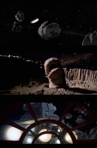 2. Han与Leia被追捕的情节分别是小行星追捕(Asteroid Field) / 洞中怪兽(the Cave Monster) / 混入垃圾堆Garbage Dump