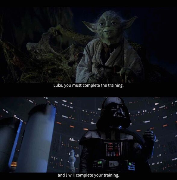 Yoda对原力黑暗面的解释,Luke进入黑暗洞穴的场景,Luke看到的未来,Yoda与Obi-Wan对Luke的劝解,以及Luke中止训练。《帝国反击战》又一与现在的公式不同的地方在于,整个训练并没有一个从菜鸟到高手的蒙太奇,老师无奈地掩面到老师满意地点了点头这样的镜头。如Obi-Wan指出Luke从未很好的掌控原力(But you cannot control it),Luke也并没有自己用原力把自己的战机拉出沼泽来,短暂的被终止的训练并没有能帮助Luke战胜强敌,反而是被利用了。这一点至关重要的,(如果按照现在cliché的模式走,成功掌握了原力,那么不仅”完成训练“的第三幕的情节明显不如现在这样有说服力,整部电影也会缺乏深度)后文会再次提到。