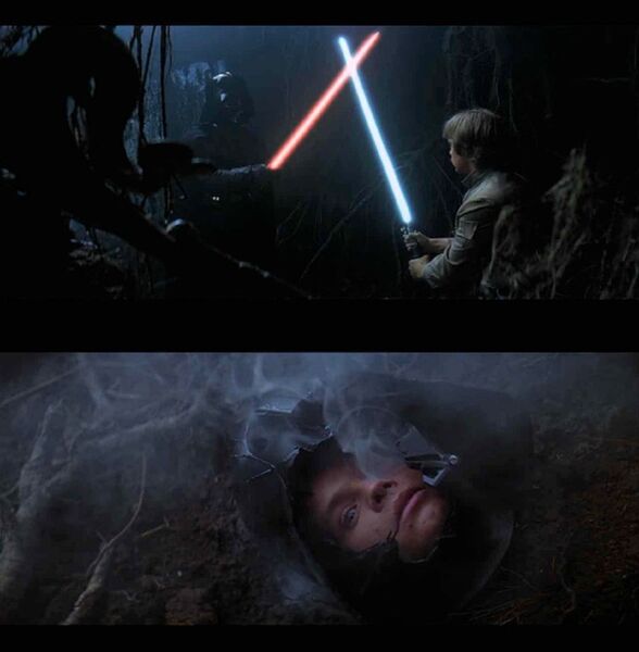 4. 通常来说影片正中间(Mid-Point)会有一个极其重要的镜头,而这里则是一个隐晦,充满矛盾与不祥,富有深意的情节,也是一个精妙的铺垫。Luke走进洞穴,与洞中的Vader决斗,砍下他的头盔后显示出的却是自己的面孔。Vader与Luke到底存在着什么关联?Luke是否会成为新的Vader?怎么会?又为什么呢?