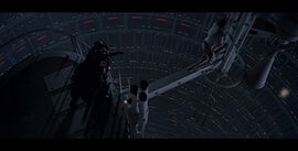 影片的最高潮并不是Vader说出自己的身份,而是Luke需要在正义与邪恶,光明与黑暗中做出自己的选择。他正面无法打败Vader又不想成为傀儡,面对这种两难的境地,最后选择了消极的方式,即消灭问题本身,自己来解决。物理空间上局限和 Luke内心进退两难相呼应: