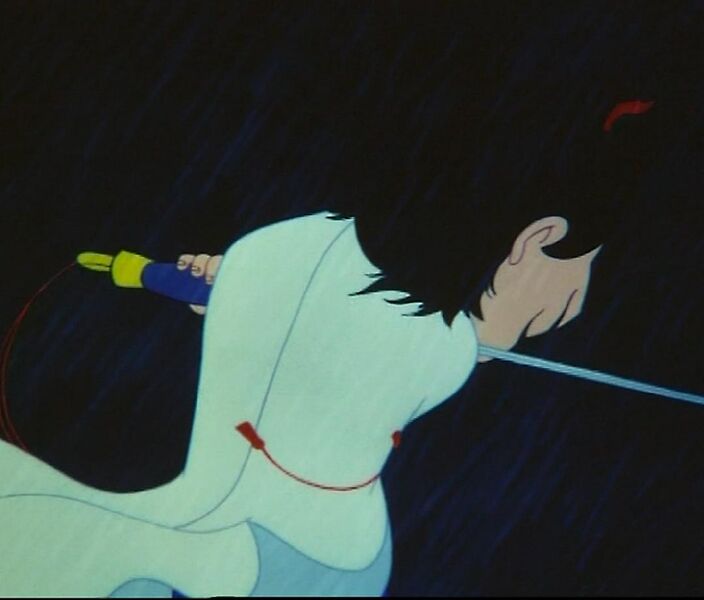风雨交加、电闪雷鸣,哪吒昂首怒吼:“师父!”横心自刎。