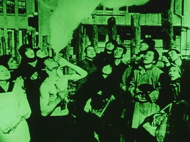 此前,影片中的楼顶闪过了举起步枪对准行人的人。还要注意的是,唱出这首歌的人们、向高仓健表白的人们似乎是底层的劳动者、是在家门口游魂般徘徊的战后伤兵、是参过战杀过人的父亲,他们一无所有,连切菜刀都没拿过,却成为了杀戮文化的牺牲品——寺山对暴力文化的反讽可见一斑,当然,也可以将这一段和此前妹妹的遭遇连在一起来看。