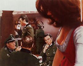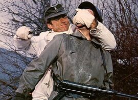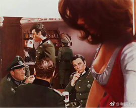 即便是动作片《血染雪山堡》里不需要大篇台词,但他最出彩的一出戏仍然是在鹰堡地下会议大厅里那出通过纯粹言语上的行骗欺诈来从纳粹将校们那里获取间谍名单的大戏。