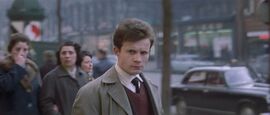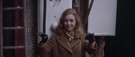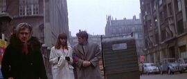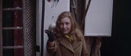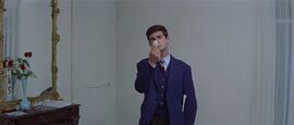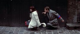 剪辑也不可小觑,戈达尔的《筋疲力尽》成为首部大规模运用跳接的影片,在本片中虽然也多次出现跳接,但真正震慑心魄的却是一段令人目不暇接的的蒙太奇,这组位于电影第54分12秒~55分46秒处的蒙太奇通过插入与前后镜头无明显关联的画面,成功摧毁了电影时空的统一性幻象,消解了这组视点镜头的连续性。摇晃不已的手持摄影时刻伴随着卡里娜与女友聊天的画外音,并时而移焦,酿制出一种使人错愕的惶恐感。在一连串的主观镜头中,行人不断与摄影机擦身而过,并望向镜头,仿若卡里娜和女友成为了万众瞩目的大明星(或是穿着奇装异服、举止和造型至为与众不同的普通人),正与路人持续对视。恍惚之间,我似乎又重回阿涅斯·瓦尔达《五至七时的奇奥》(1962)中的巴黎街头,在或将面对死亡的隐忧中踽踽独行。此组蒙太奇段落时不时被突兀的机位变更的画面所中断,从前至后的完整次序如下:与行人对视的主观镜头(正反打机位对切)——对安琪拉公寓及蔚蓝天空的仰拍——同前——高位街景俯拍——同前——中景双人镜头(卡里娜与女友)——凯旋门后侧面局部的缓慢上升镜头——中景双人镜头——同前——中景双人镜(握手告别)——5个身处不同地点的卡里娜特写快速组接——与贝尔蒙多在酒吧的中景(分居左右侧),至此蒙太奇完结。这是对爱森斯坦式的苏联形式主义蒙太奇理论的反诘,镜头与镜头间的组接不再是具有明晰意义或隐喻色彩的教化手段,无需去深究那难以寻觅的个中意味,刹那间,我仿佛听到了时光一片片碎裂开的钝响,周身绵软,彻底动弹不得。