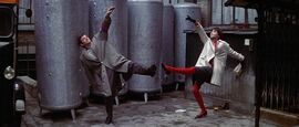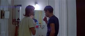 除了随性活泼的准歌舞场景,影片还有许多搞怪有趣的桥段。布里亚利与卡里娜比拼小舌颤音,憋足了气争相展示嗓门。贝尔蒙多来到公寓,与布里亚利以拙劣的表演争夺芳心,前者模仿拳击手练独角戏,后者“偷偷”从口袋摸出鸡蛋,迟缓地抬手将其“变出来”。布里亚利故意在话说到半截时开始刷牙,嘴里叽里咕噜地使人完全摸不着头脑,卡里娜也原样复制,像极了两个古灵精怪的捣蛋鬼。莲蓬头失灵了,卡里娜便找出一柄榔头,以敲击水管来充当淋浴的人工开关。