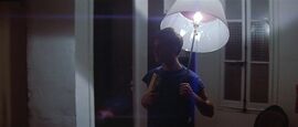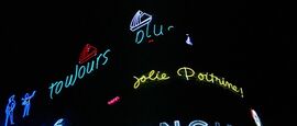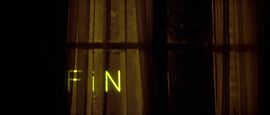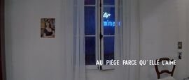 霓虹灯标示出的质能方程“E=mc^2”曾在戈达尔斩获柏林金熊奖的反乌托邦科幻经典《阿尔法城》(1965)中反复用作插入性的画面,以打破电影的连贯性。本片则早已先行一步,中途出现的“Still has nice breasts”和结尾的“FIN”字样都将霓虹灯组成的字句当作辅助性字幕,参与了叙事环节。
