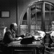 奥菲尔斯通过剧作和构图为电影构建了一个不断重复、前后呼应的画面体系,路易斯的情人多纳蒂男爵第一次出场也是从右手开始,画面中同时还有那对耳环。接着是一个典型的奥菲尔斯式调度,镜头从皮箱中后退,男爵的目光被画外空间中“某夫人”所吸引,摄影机左摇,路易斯划了一个长长的半圆形轨迹从背景走来,多纳蒂随着她同向180°转身,注视着路易斯逐渐接近。路易斯在距离摄影机最近时和男爵擦身而过,摄影机右摇,和男爵一起目送伊人远去。奥菲尔斯总喜欢让恋人们绕着对方转圈,在漩涡般的圆周运动中越陷越深,直到献出生命。