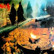 所谓江湖人士讲究的是逍遥自在,不受拘束,不管是佛家弟子还是道家弟子,都是认同的。因此常常是有人想要一统江湖,发号施令,当武林盟主的时候,往往也就是腥风血雨的时候。新火烧红莲寺虽然不是这样的故事情节,但是说到底也是反抗奴役和暴力的故事。毫无疑问,影片极具乱世景象和江湖气息,开片一幕,少林寺被灭,少林弟子被帮着跪在寺门前,清兵疯狂焚烧经书。片中,镜头到红莲寺时,荒芜的沙漠中,矗立着一座石窟一样的寺庙,红色的石门彷如一张大口。寺外死尸倒佳,骷髅成堆,活埋者双手举天,佛像狰狞,都预示着这里是一个人间地狱,使我想起集中营,或许导演也是借助二战的纳粹集中营这个元素, 来增加神公这个极权统治者的恐怖和残忍。方世玉被关进机关重重的红莲寺地下牢房(我觉得还是集中营合适), 妓女豆豆被鹰犬滴血子献给神公当侍女。影片中角色塑造最成功的不是方世玉,也不是洪熙官,而是那个恶魔一样的神公。当少林弟子不服从者与女鹰犬翠河在生死台大战,神公的初次出场了,侍女簇拥着坐在一个太师椅上,抽着烟壶,让人倒觉得他慈眉善目。这个看似斯文的神公,闲时喜欢画画鬼符一样的东西,让人神秘莫测。不服从者中了机关被打落地沟烈火烧死的时候,再看看神公的表情,你就可以知道他的冷血了。 方世玉为了救人,冲出来与翠河斗,打败翠河准备刺杀神公时,却被赶来当卧底的洪熙官截住,最后,方世玉受伤被扔进疽虫蠕动、老鼠乱爬,和骷髅满地的尸井中,这个画面,一直让我觉得这个是恐怖片了。