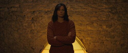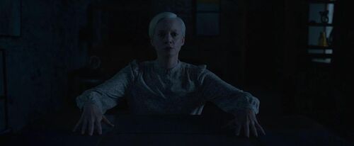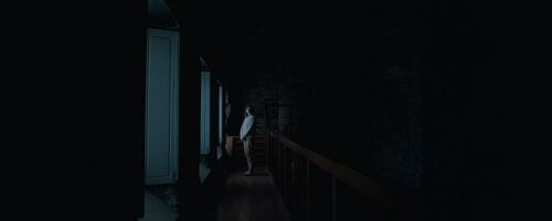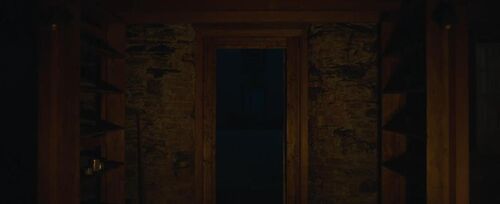 悠长紧张的配乐,带着风雨欲来的氛围为该片拉开了序幕。丹妮开场的桥段,镜头由环境出发,大量固定镜头串起该段落,并在午夜时刻达到高潮。异响的正门,两边黑暗的回廊,之后奥林惨案时的门和开门特写,都是以镜头静态的展现着这些环境中的恐慌和未知,也能看到导演对此前作品风格的保留——静默。
