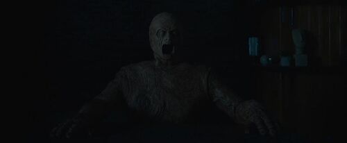 在之前作品中成功塑造报警器一般神秘的敲鼓兔和尸变女鬼后,这次导演也为观众献上了两个足够出色的怪物。首先当然是真主角木头人,它的设计完全秉承着无声尖啸的概念,虽然它不能发声,但它张大的嘴一直在尖叫。其次是惊鸿一瞥的杀手,挺有无声夜和惊声尖叫的范儿,可惜这不是砍杀片。