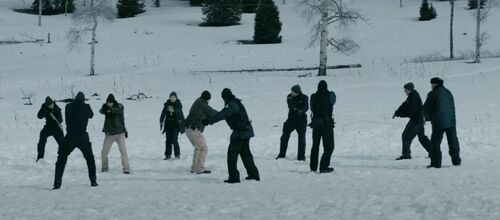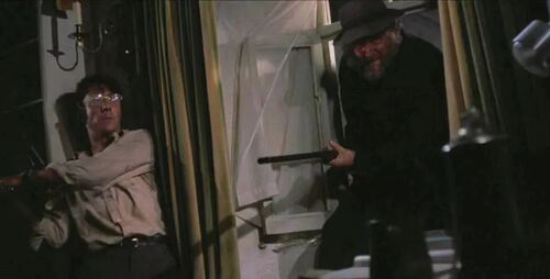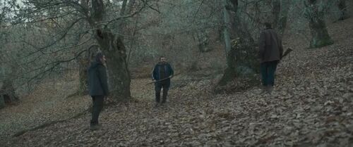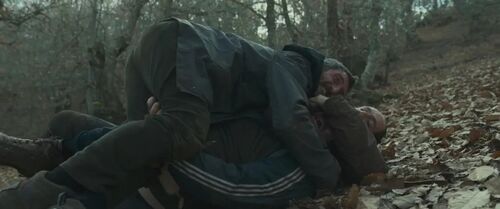 所以,当三人摸爬滚打于枯黄的落叶中,不单纯是两只“兽”扼杀一个“人”的惨剧。而是一个文化“入侵——反入侵”、文明“征服——反征服”的社会寓言。置身荒野,卸去伪装,其实大家都是野“兽”,就连先前软弱无能的“文明”手里也是有武器的。